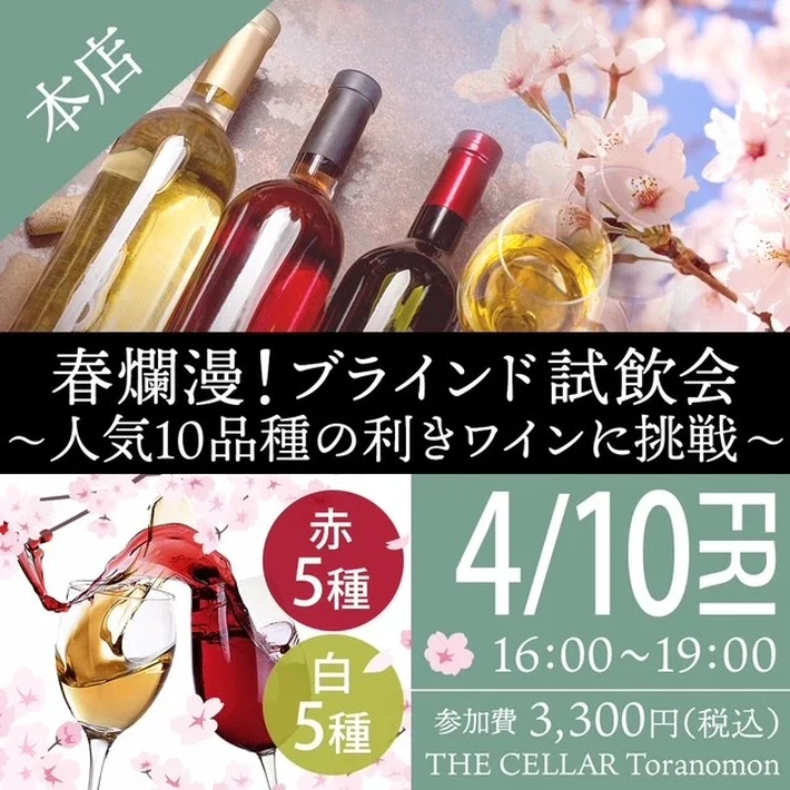 【主催者からのコメント】 4月10日(金) 、虎ノ門本店にて春爛漫!ブラインド試飲会を開催いたします。 白・赤 各5種。計10種のブラインドテイスティングに挑戦! シャルドネ、ピノ・ノワールを含む人気品種を中心に出題します。 なるべく”品種の個性がわかりやすいワイン”をセレクトしましたので、ソムリエ試験対策や腕試しとしてもおすすめです。 もてる感覚をフル稼働・・・