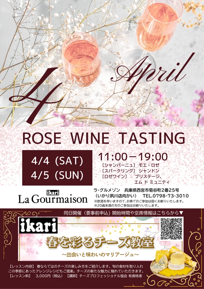【主催者からのコメント】 ikari ラ・グルメゾン主催のワインイベントです。 4月お花見にふさわしいスペシャルロゼワインのテイスティングとともに、春ならではのチーズの楽しみ方をご紹介します。旬の食材を取り入れ この季節にぴったりのアレンジレシピもご提案。チーズの新たな魅力に触れていただきます。 ■ 開催日 2026年04月04日(土)~05日(日) ■ 時・・・