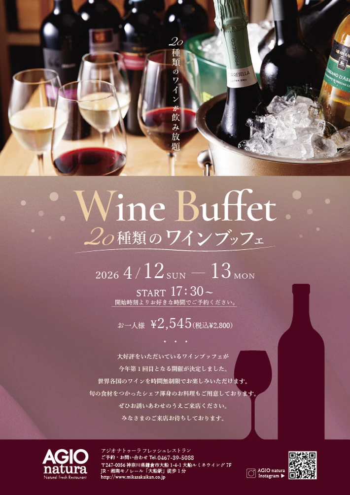 【主催者からのコメント】 AGIO natura 大船 (株式会社三笠会館)主催のワインイベントです。 AGIO大船より、4/12(日)・13(月)に開催するワインビュッフェのご案内です。 世界各国の20種類のワインが時間無制限で飲み放題となる毎回ご好評をいただいているイベントです。 ぜひお誘いあわせのうえご来店ください。 <ワインブッフェ> ○4/12(日・・・