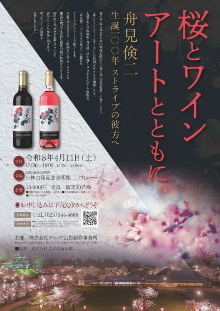【主催者からのコメント】 今年で5回目となるこのイベントは、観桜会会場内にある小林古径記念美術館で行われます。美術館内の二ノ丸ホールを会場に、夜桜や美術館に展示されている芸術作品にふれながら、地元ワイナリーでつくられた岩の原ワインや地元飲食店が手がける特別料理を味わってもらおうと、上越市内のデザイン・制作会社のキャップ広告制作事務所が毎年企画しています。 ■・・・