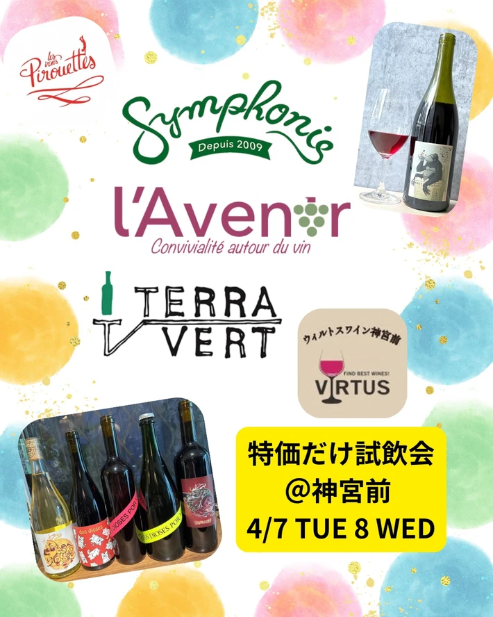 【主催者からのコメント】 ウィルトス神宮前主催のワインイベントです。 今回は、決算前ということで各インポーターさんより特価ワイン集めてみました!! 最大25%OFF‼️ 『サンフォニー』 レザン ア プリュムのキングコング含む赤2種20%OFF‼︎ ラングドックよりドメーヌ デ アブリガンの ミュスカオレンジなど泡オレンジロゼ3種が25%OFF‼︎ 『テラヴ・・・