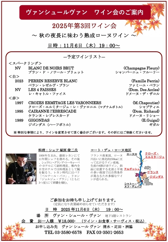 ヴァン・シュール・ヴァン主催のワインイベントです。 【主催者からのコメント】 秋の夜を彩るのは、時を重ねたロー・・・