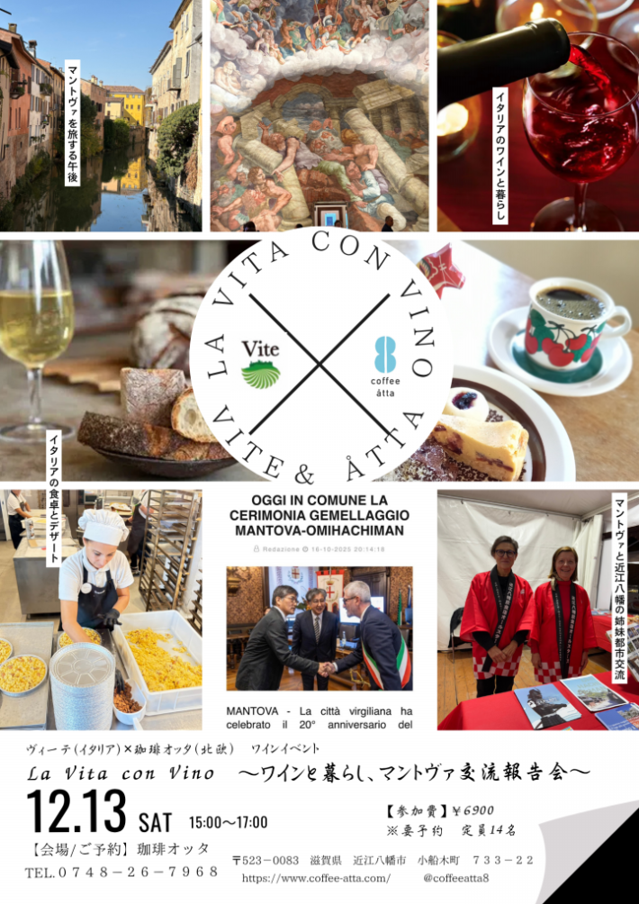 【主催者からのコメント】 12/13(土)に、珈琲オッタにてヴィーテさんをお招きしたワインイベント第二弾を開催いたします。 前回は、「ローマ」でしたが、今回のテーマは、「マントヴァ」です。 ワインのテイスティングのミニレクチャーから、マントヴァについてのお話、マントヴァのワイン、ヴィーテの前菜・マントヴァのパンや郷土菓子・オッタの珈琲をお楽しみいただける会と・・・