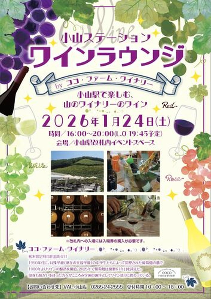 【主催者からのコメント】 小山ステーション ワインラウンジ byココ・ファーム・ワイナリー 小山駅で楽しむ山のワイナリーのワインを初開催します! 様々な種類のワインとともにハープや電子ピアノなどの演奏もお楽しみいただけます♪ ■ 詳細・申込み VAL小山 ココ・ファーム・ワイナリーイベント