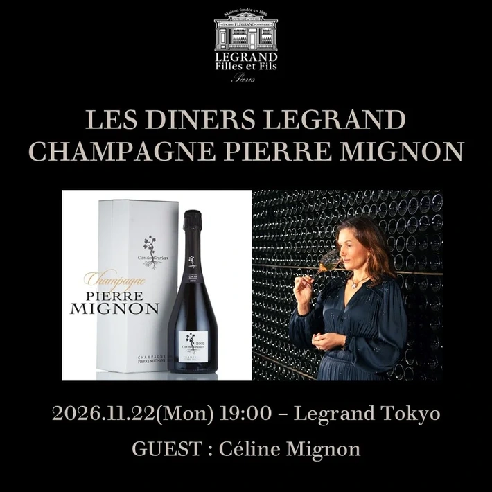 ※画像上の開催日は11月になっていますが、1月が正しいものと思われます。 【主催者からのコメント】 ヴァレ・ド・ラ・マルヌに1892年に創業され、ラデュレのハウスシャンパーニュを手掛けることでも知られる名門シャンパーニュ・ピエール・ミニョンの5代目当主セリーヌ・ミニョン女史を招いてレ・ディネ・ルグランを開催いたします。 生産者から直接お話をお伺いしながら・・・