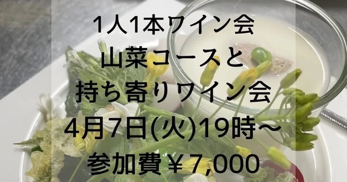 【主催者からのコメント】 1人1本ワイン会はシェフのお料理に合わせて皆さまが持ち寄ってくださったワインを楽しむ会です。 今回は春の味覚☘️【山菜コース編】です♪ 人口約2,000人!長野県の秘境小川村から届く山菜を使用したコースです。 標高500m〜1,000m。 日本で最も美しい村連合の一つ、小川村。 澄んだ空気と美しい水と栄養たっぷりの土で育った山菜は冬・・・
