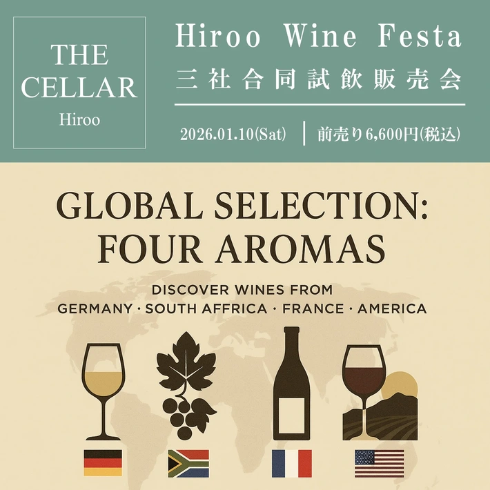 【主催者からのコメント】 ”Hiroo Wine Festa ~“Global Selection: Four Aromas”~ドイツ・南アフリカ・フランス・アメリカ、世界4カ国のワインをめぐる試飲会~” \平均価格11,900円!世界を旅するように4カ国の個性を味わえるワイン体験/ 1月10日(土)、THE CELLAR Hirooにて特別試飲イベント「G・・・