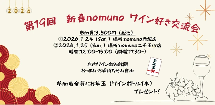 【主催者からのコメント】 nomuno主催のワインイベントです。 大人気のワイン好き交流会~新春ver.~ 赤坂店・二子玉川店2か所にて2日間の開催! ※チケットの買い間違え・開催場所にご注意ください 今回はお年玉として参加者全員へお土産ワインを1本プレゼント!お楽しみに! 初めての方、お一人での参加の方も安心してご参加ください!!すごくカジュアルなイベント・・・