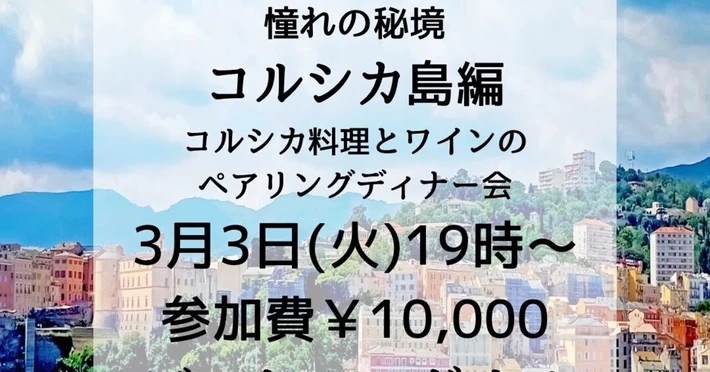 【主催者からのコメント】 行ってみたい!知りたい! そんな街をお料理とワインでフレンチ旅♪ 今回は憧れの秘境コルシカ島編です♪ 前回のパリ編で登場したナポレオンの聖地! コルシカ島。グルメはもちろん! ワインも購入して飲む機会もなかなか少ないかと思います。 コルシカの魅力に迫りながら! 是非郷土料理やワインを一緒に楽しみましょう☆ 歴史や文化!名スポット! ・・・