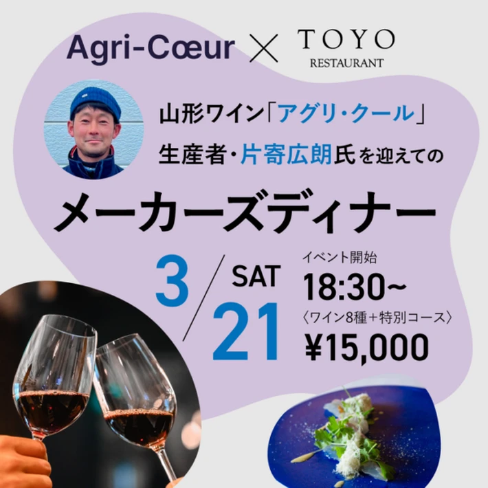 【主催者からのコメント】 Restaurant TOYO Tokyoでは、グラスワインやペアリングワインに日本ワインを積極的に取り入れております。 なかでも、ソムリエ佐藤がいち早く注目しお取り扱いを続けてきた山形の生産者「アグリ・クール」。このたび、栽培・醸造責任者である片寄広朗氏をお迎えし、メーカーズディナーを開催いたします。 当日は、この日のためにご用意・・・