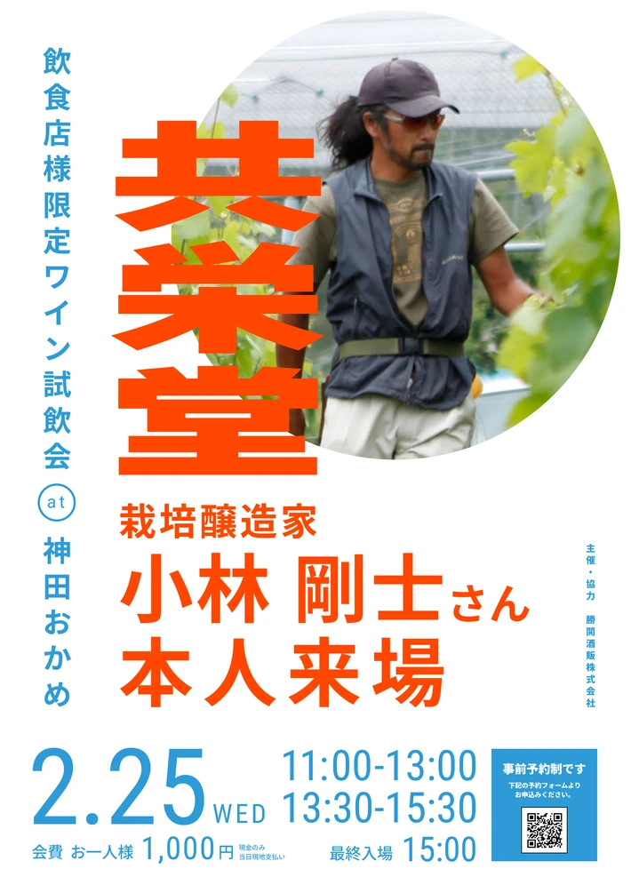 ※飲食店関係者限定のイベントになります。 【主催者からのコメント】 勝鬨酒販株式会社主催のワインイベントです。 今回の試飲会は、共栄堂 栽培醸造家 小林剛士さんご本人が会場に来場されます。 畑での向き合い方、ワイン造りの考え方、そしてなぜ今この味わいになっているのか。 ワイン単体の説明ではなく、造りの背景・思想までも含めて、直接伺える試飲会です。 小林さんご・・・