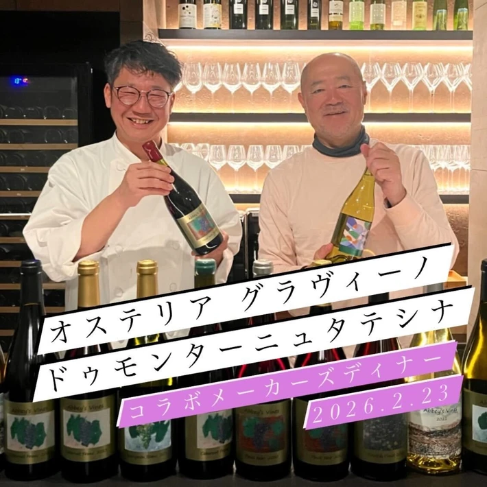 【主催者からのコメント】 Domaine Deux Montagnes tateshinaの安孫子尚さんと山岡剛さんが手掛けたワインとOsteria gravinoの緒続文一さんにお作り頂くお料理とのマリアージュをご堪能頂ける特別なメーカーズディナーを開催します! ワインは希少なバックヴィンテージのワインも含めて、合計16アイテムをご提供させて頂きます。 ワ・・・