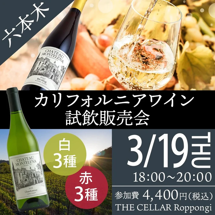 【主催者からのコメント】 六本木にて「カリフォルニアワイン 試飲販売会」を開催いたします。 カリフォルニアの多彩な魅力について、飲み比べをお楽しみいただける当イベント。 今回のラインナップは・・・ 爽やかなテイストの白ワインや、果実味、樽感しっかり濃厚な赤まで、王道カリフォルニアを感じられるワインをご用意しております。 そして注目は・・・ パリスの審判で一躍・・・