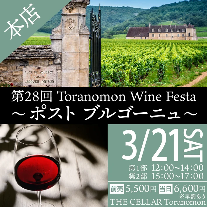 【主催者からのコメント】 2026年3月21日(土) THE CELLAR Toranomonにて第28回 Toranomon Wine Festa「ポスト ブルゴーニュ」を開催いたします。 さてさて、毎月第3土曜日に開催しているToranomon Wine Festa 通称 ”トラフェス” 。 第28回目の今回のテーマは 『ポストブルゴーニュ』 になります・・・