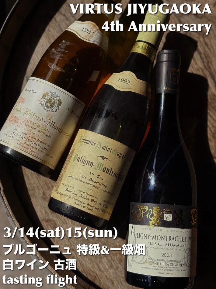 【主催者からのコメント】 ウィルトス自由が丘主催のワインイベントです。 「ウィルトス自由が丘・4周年記念イベント」の一環として、貴重な80年代&90年代の特級畑/一級畑の白ワイン古酒と最新2023年ヴィンテージの一級畑を比較します。 ★フォンテーヌ・ガニャールによる、シャサーニュ・モンラッシェ村の特級畑”クリオ・バタール・モンラッシェ ・・・