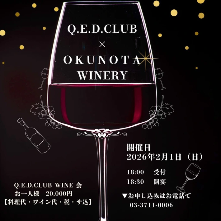 【主催者からのコメント】 山梨県塩山のワイナリー『奥野田葡萄酒醸造』より中村ご夫妻を招いての特別なメーカーズディナーを開催します。 小さいながらもこだわりが詰まったワイン造りを実践する奥野田ワイナリー。 ブドウ栽培や希少なワイン醸造のこだわりを聞きながら! 今回のためだけにご用意したスペシャルワインとQ.E.D.CLUBフレンチ特別フルコースのマリアージュを・・・