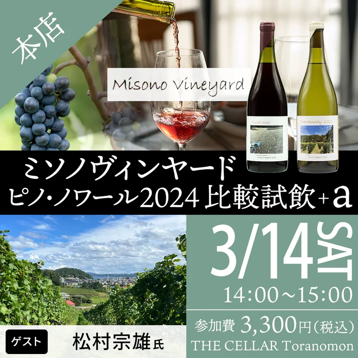 【主催者からのコメント】 北海道余市のピノ・ノワールについては、すでに多くの方にとって信用のできる産地のひとつになってきているのではないでしょうか。 今回はその余市からミソノヴィンヤードのオーナー兼醸造家の松村宗雄さんを講師にお招きして、最新ヴィンテージのピノ・ノワール2024の3つのキュヴェを比較試飲しながら、その可能性を探っていければと思います。 またピ・・・