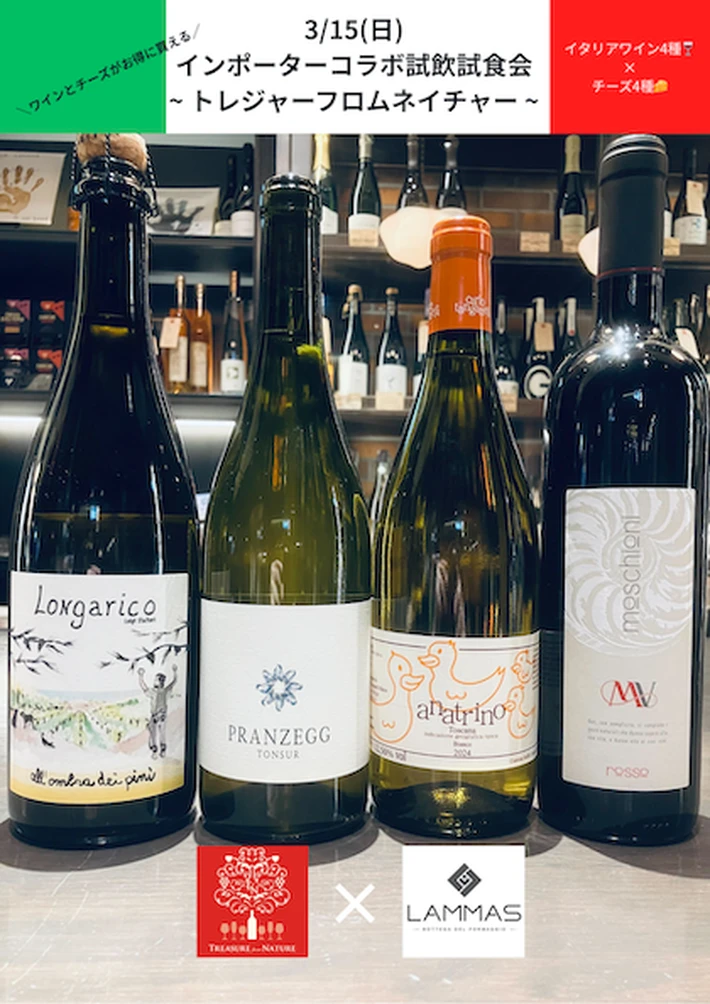 【主催者からのコメント】 3月15日(日) はワインインポーターさんが来店しての試飲試食会!! イタリアワインインポーターの “トレジャーフロムネイチャー” さんが来店してくださいます。 多種多様なテロワールと土着品種からつくられるバラエティ豊かなイタリアワイン🇮🇹 そんな魅力たっぷりのイタリアワイン4種類とLAMMASのチーズ4種類・・・