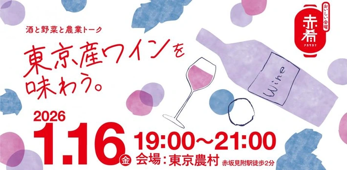 【主催者からのコメント】 赤坂で、旬の野菜と農業トークを肴に、酒を呑む、赤肴(アカサカナ) こんにちは、赤坂見附の「東京農村」です! 新年!最初の企画は、東京産のワインを味わいたいと思います。 都内のワイナリーで丁寧につくられたワインを気軽に 味わいながら、楽しむ交流イベントです。 ワインに詳しくなくても大丈夫です。「東京のワインってどんな味?」そんな好奇心・・・