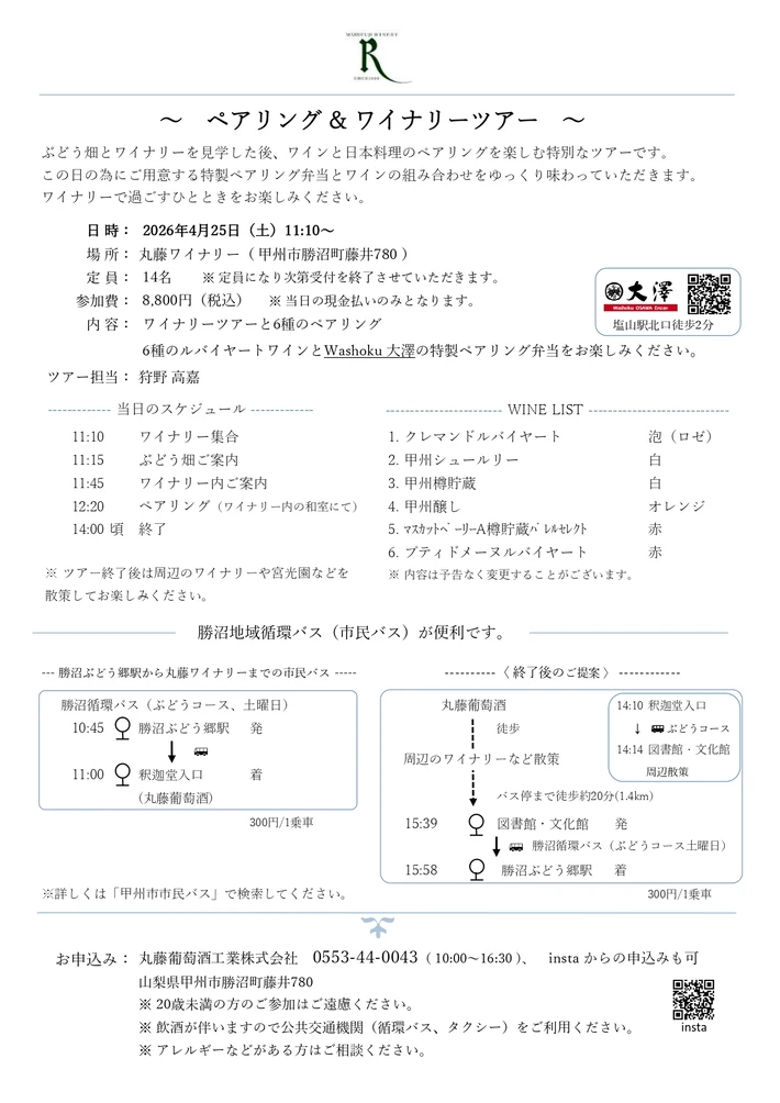 ぶどう畑とワイナリーを見学した後、ワインと日本料理のペアリングを楽しむ特別なツアーです。